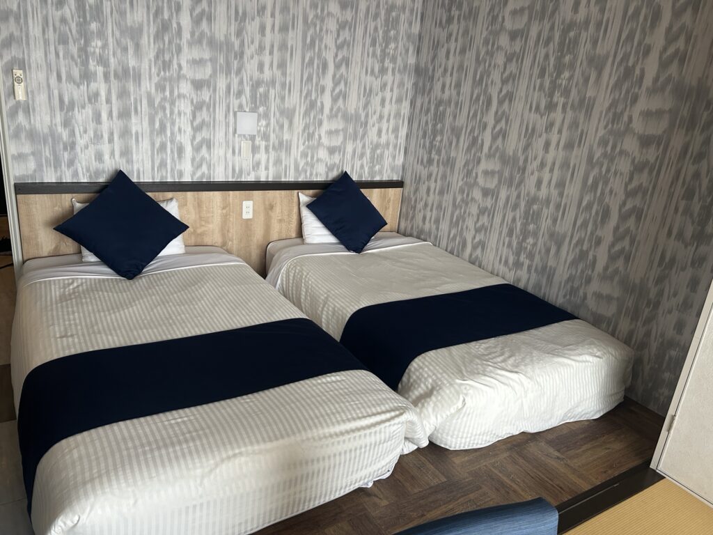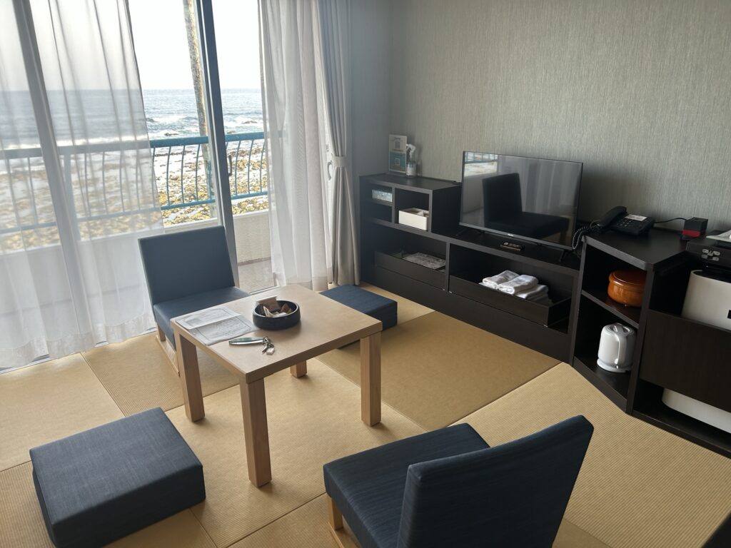 今回宿泊したのは「オーシャンビュー和洋室」。部屋に入ると大きな窓から見える太平洋!畳スペースとベッドがあり、家族連れでも十分広々使えると思います。家族連れに優しい心配りを感じました。