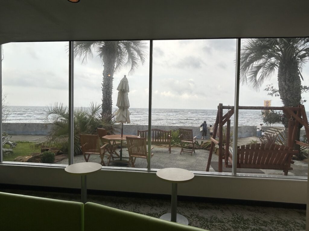 車で訪れましたが、GWということもあり駐車場はかなり埋まっていましたが奥の方に空きを見つけて駐車!ホテルに到着すると目の前に広がる海にテンションアップ。フロントスタッフの方も親切で、スムーズにチェックインできました。ホテルのロビーは落ち着いた雰囲気で、17:00までのウェルカムドリンクもあり、お土産コーナーもとて充実していました。